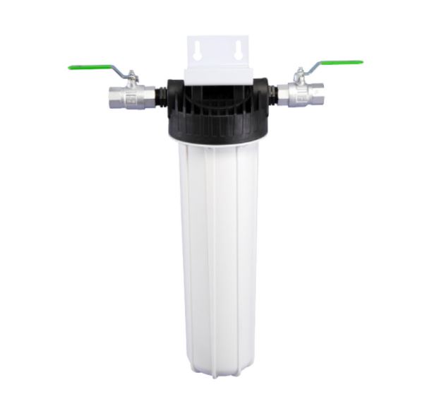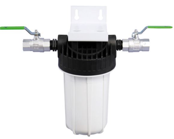 Hauswasserfiltergehäuse zum Einbau in die zentrale Wasserleitung am Hauseingang nach der Wasseruhr. Filtergehäuse und der Filterkopf mit Entlüftungsventil bestehen aus lebensmittelechtem und hochfestem Kunststoff.
