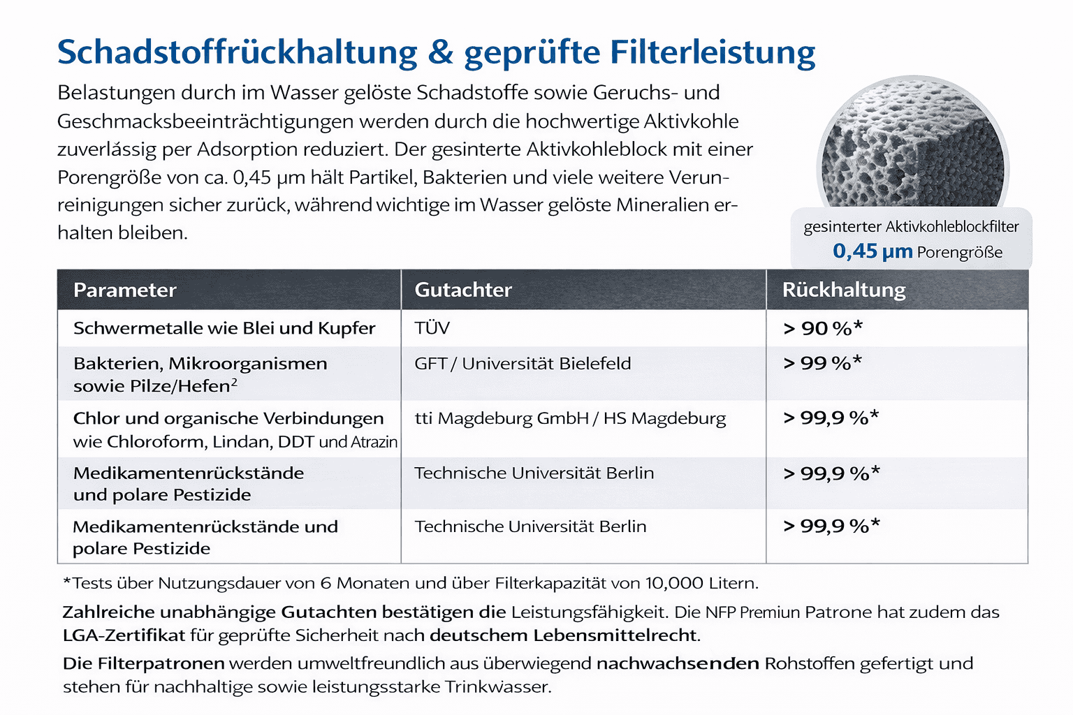 | NFP Premium | Bewährter Allround-Aktivkohlefilter | Normale Trinkwasserqualität | Standardlösung für die meisten Haushalte |