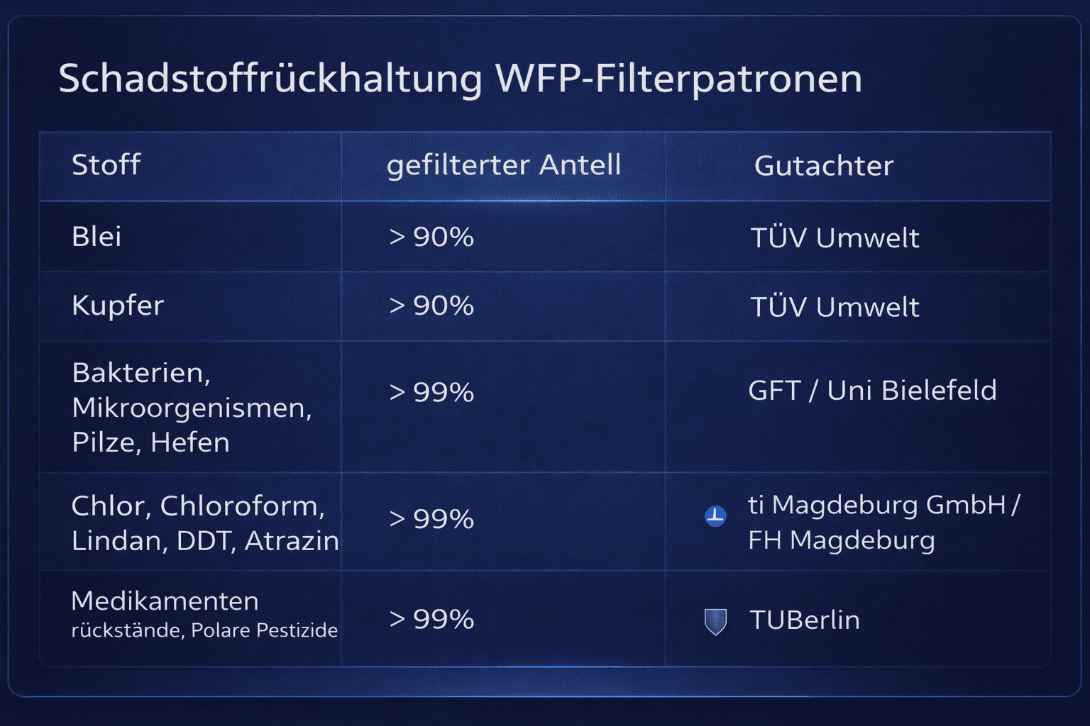 Die große Aktivkohlemasse der WFP Filterpatrone sowiedas spezielle Herstellungsverfahren garantieren ein Höchstmaß an Adsorption von organischen Schadstoffen (Medikamentenrückstände, polare Pestizide usw.) und eine sichere Entfernung von Geruchs- und Geschmacksbeeinträchtigungen. Ihre Filterfeinheit bewirkt eine hohe Filtersicherheit gegenüber Sedimenten, allen anderen Partikeln oder Bakterien. Im Wasser gelöste Mineralien bleiben erhalten.
